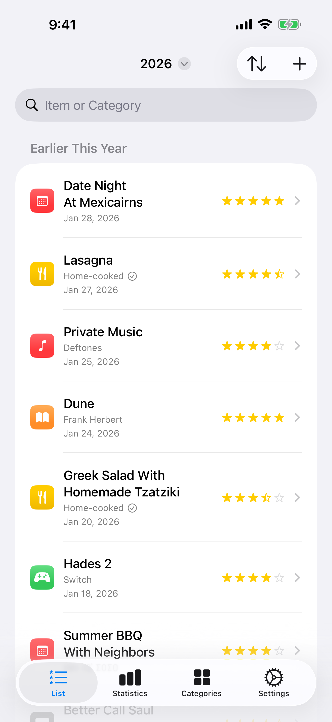 Use our templates or build custom lists from scratch. Start with Books, Albums, Games, Meals, and more.